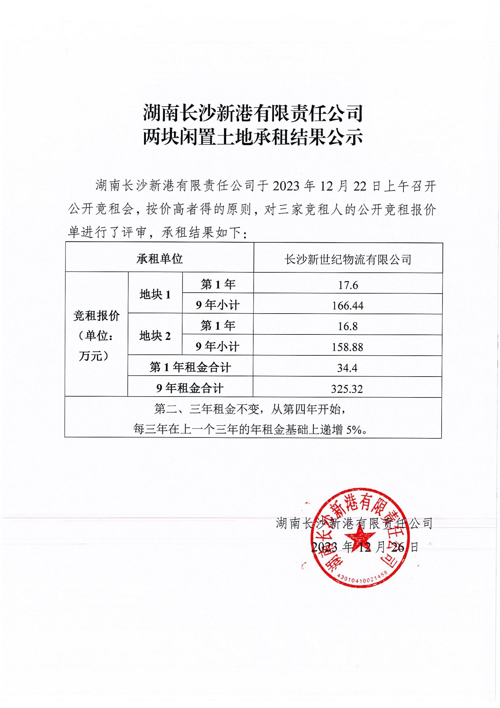 長(zhǎng)沙新港兩塊閑置土地承租結(jié)果公示